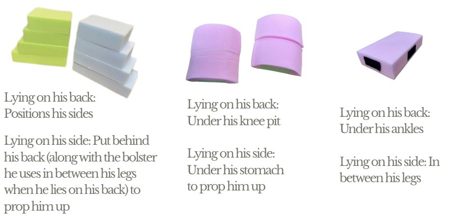 3) Configuring bolsters in a way that can be used in multiple areas, depending on if Gabe is positioned on his side or on his back.